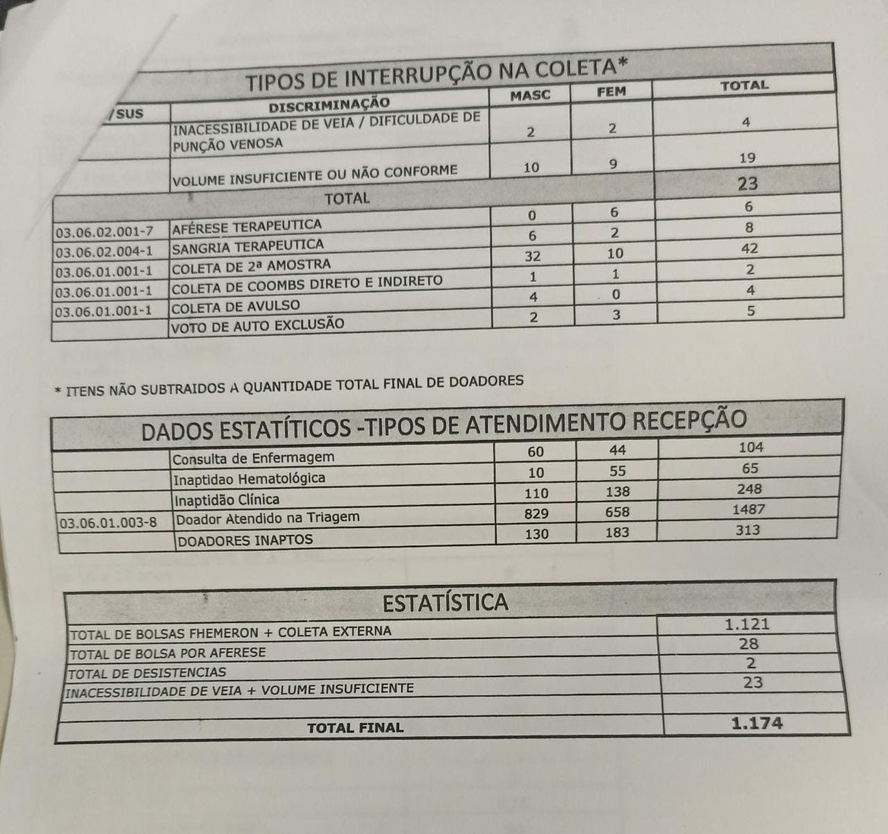 É apresentado um resumo dos dados gerais do relatório como um todo. Total de bolsas Fhemeron + coleta externa (é um dado extraído a partir da soma do total de bolsas da Fhemeron + coleta externa, subtraídos pelo número total de tipos de interrupções na coleta), mais a soma do total de bolsas por aférese, total de desistências, e a soma da inacessibilidade de veia com o volume insuficiente.