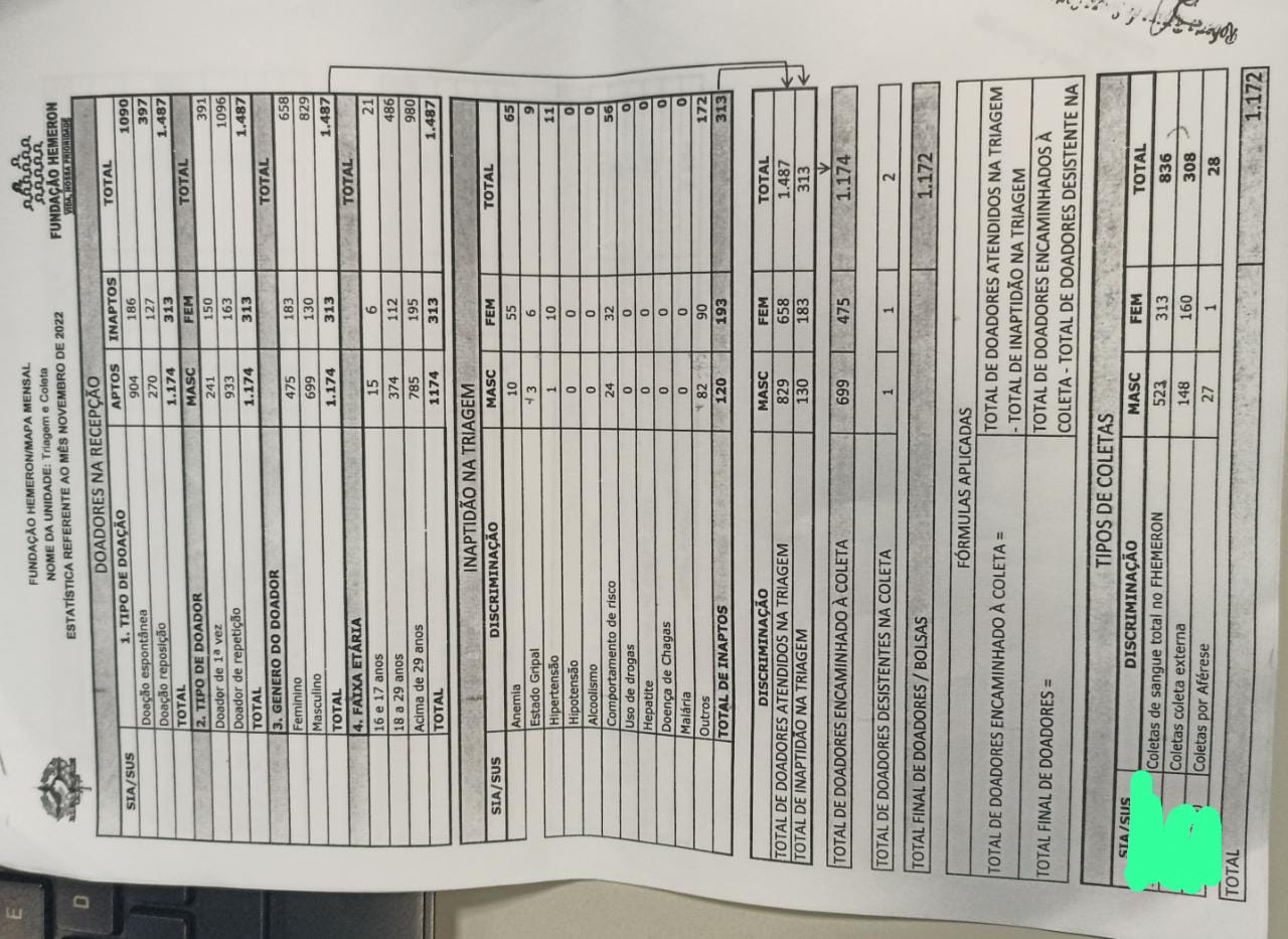 - Doadores inaptos: a soma de todos os doadores que apresentaram inaptidão na triagem.